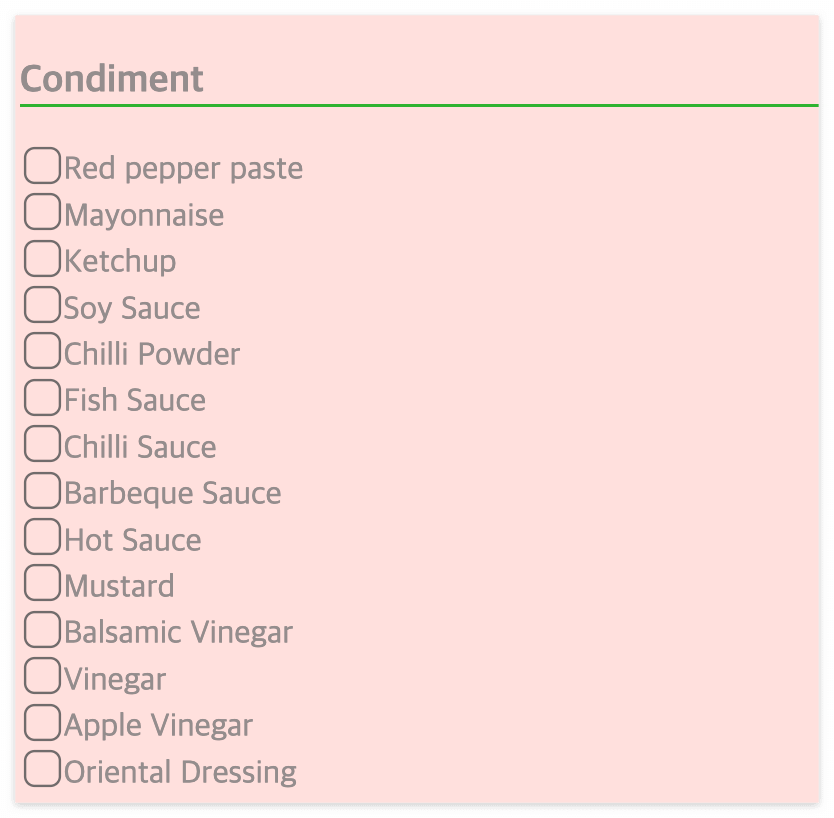 let condiment = ['Red pepper paste', 'Mayonnaise', 'Ketchup', 'Soy Sauce', 'Chilli Powder', 'Fish Sauce', 'Chilli Sauce', 'Barbeque Sauce', 'Hot Sauce', 'Mustard', 'Balsamic Vinegar', 'Vinegar', 'Apple Vinegar', 'Oriental Dressing'];
