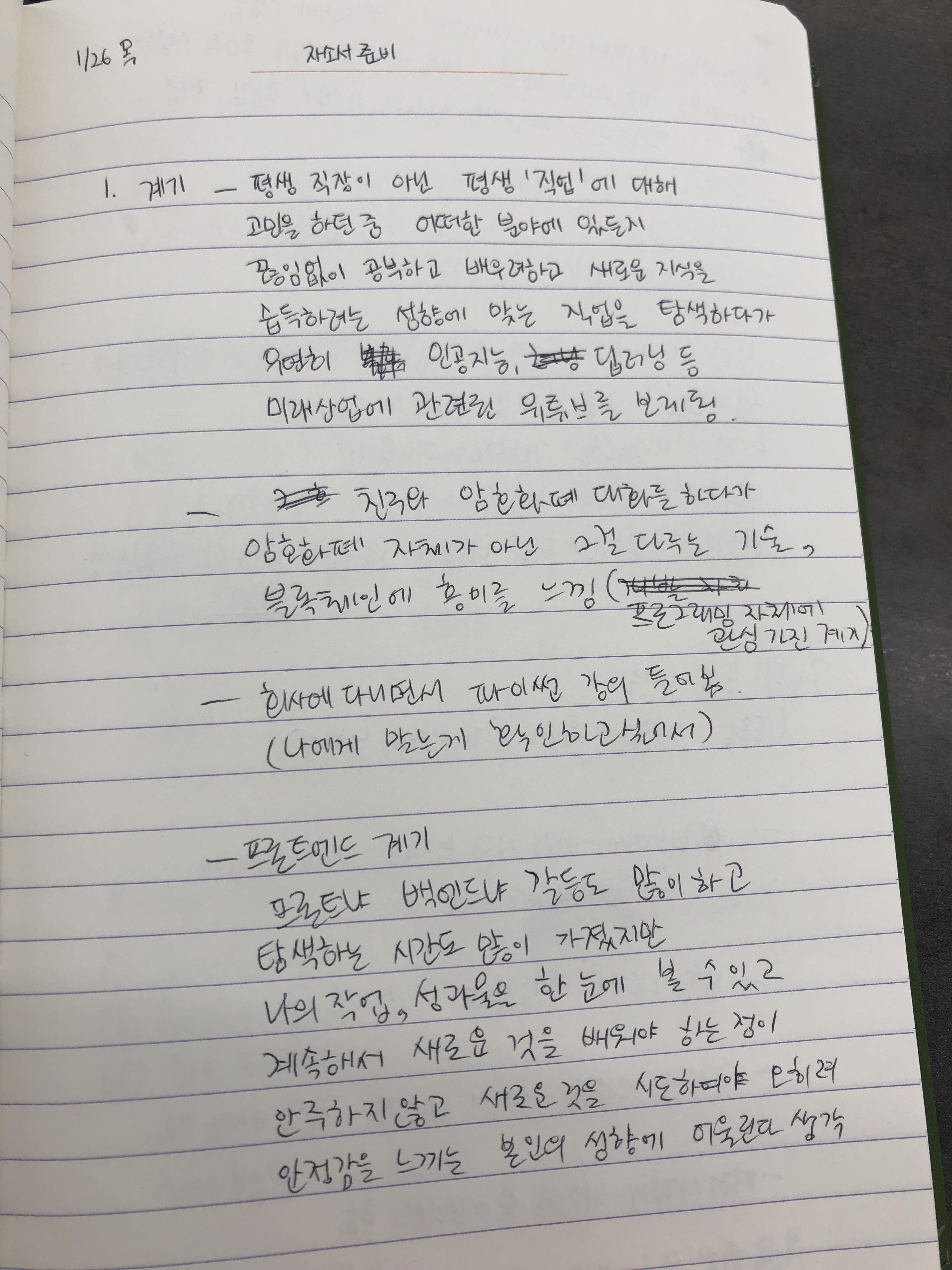 본격적으로 자소서 작성 하기 전, 일단 생각나는 대로 끄적여봤다 (나 원래 글씨체 안 이럼.. 그냥 날려 쓴 거임)