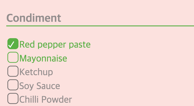 let condiment = ['Red pepper paste', 'Mayonnaise', 'Ketchup', 'Soy Sauce', 'Chilli Powder', 'Fish Sauce', 'Chilli Sauce', 'Barbeque Sauce', 'Hot Sauce', 'Mustard', 'Balsamic Vinegar', 'Vinegar', 'Apple Vinegar', 'Oriental Dressing'];