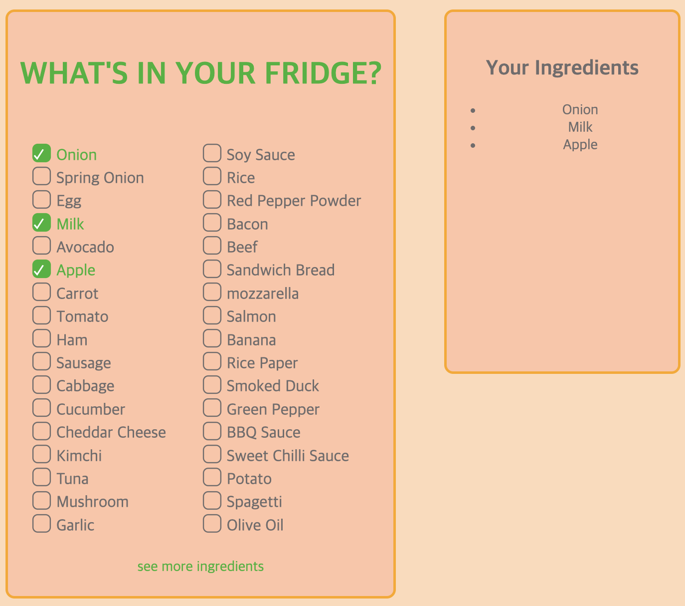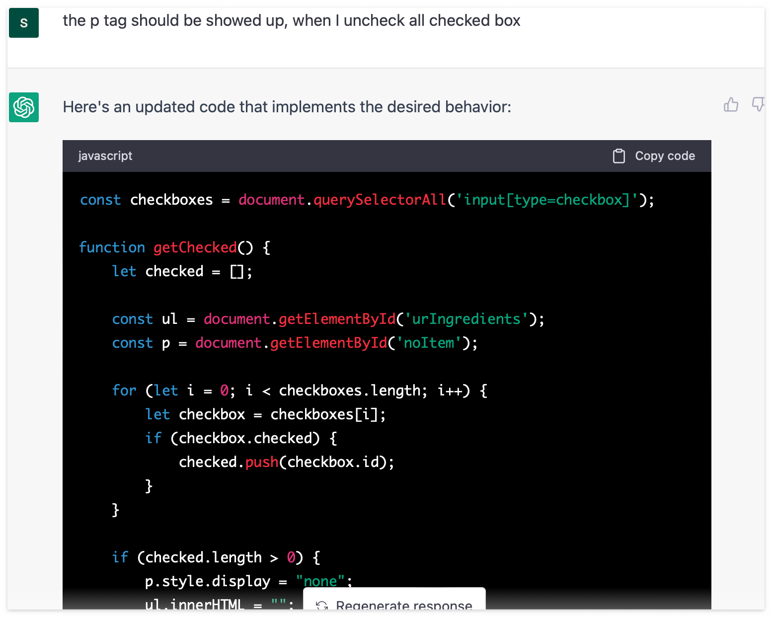 그런데 체크하면 'No selected ingredients' 라는 문구는 사라지게 만들고 싶은데 p.remove();를 해도 되지 않아서