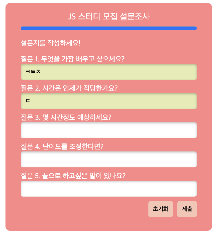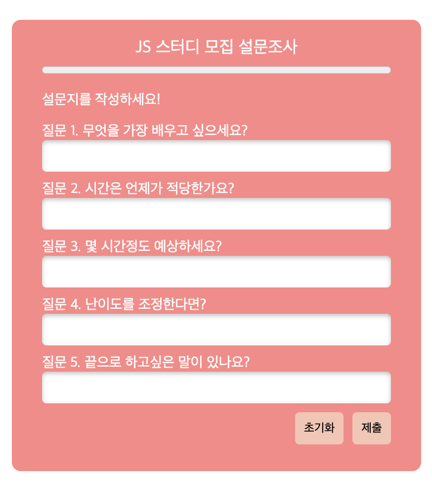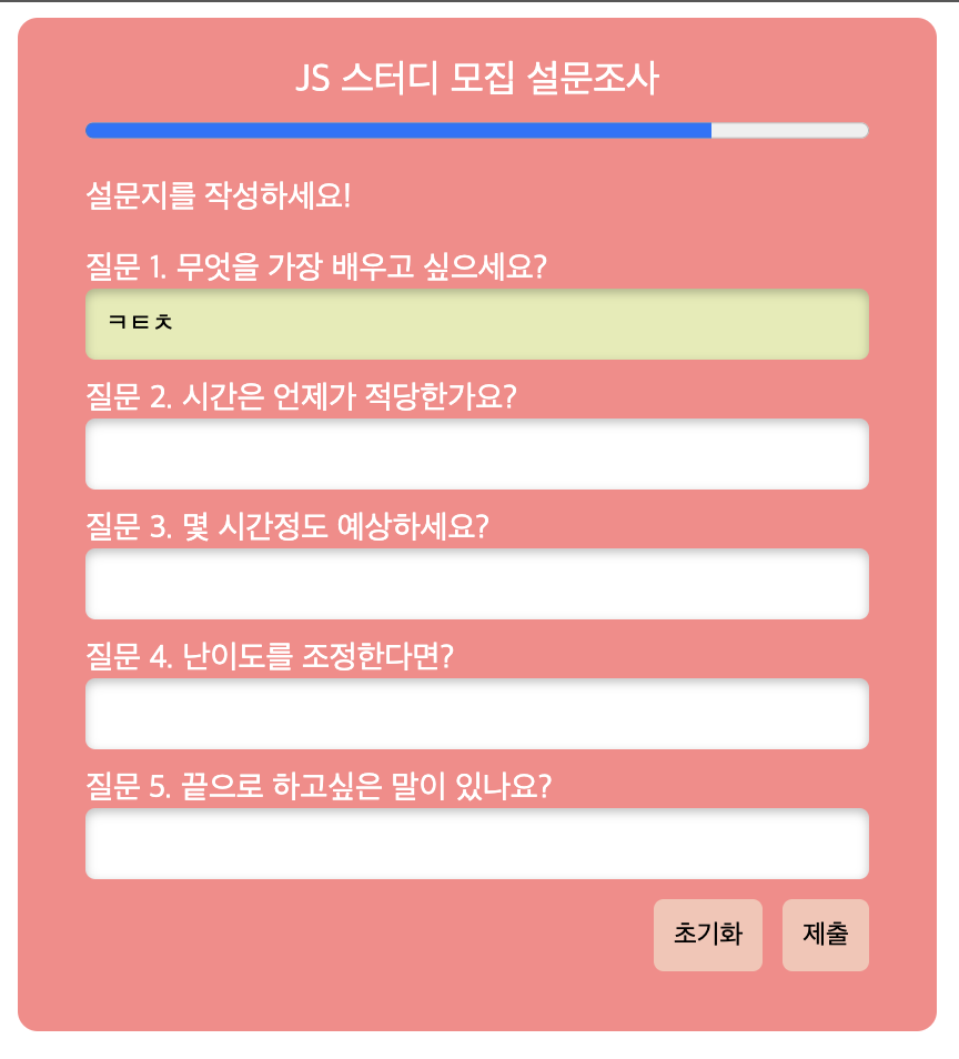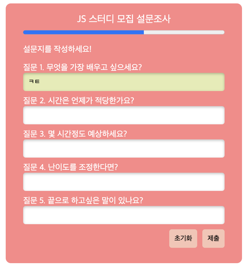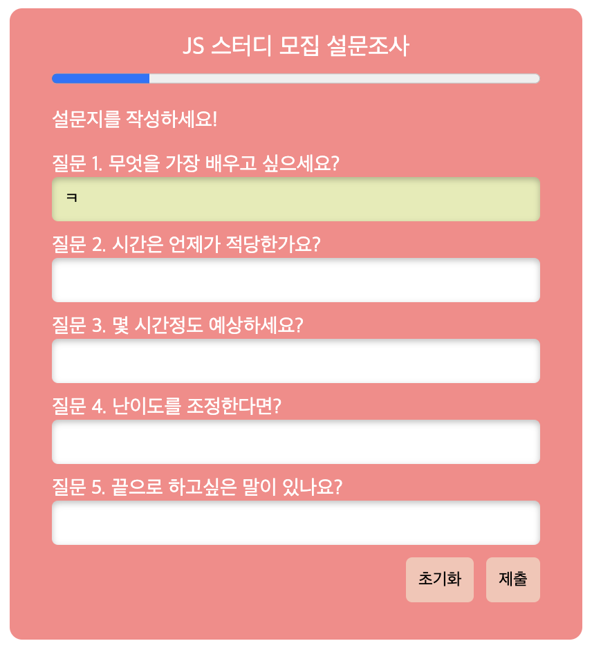 input창에 입력을 하면 프로그래스 바가 20퍼센트씩 올라가도록 하는 것이 목표였다 (그래서 총 5개의 input text창을 채우면 프로그래스가 100퍼센트가 되도록)