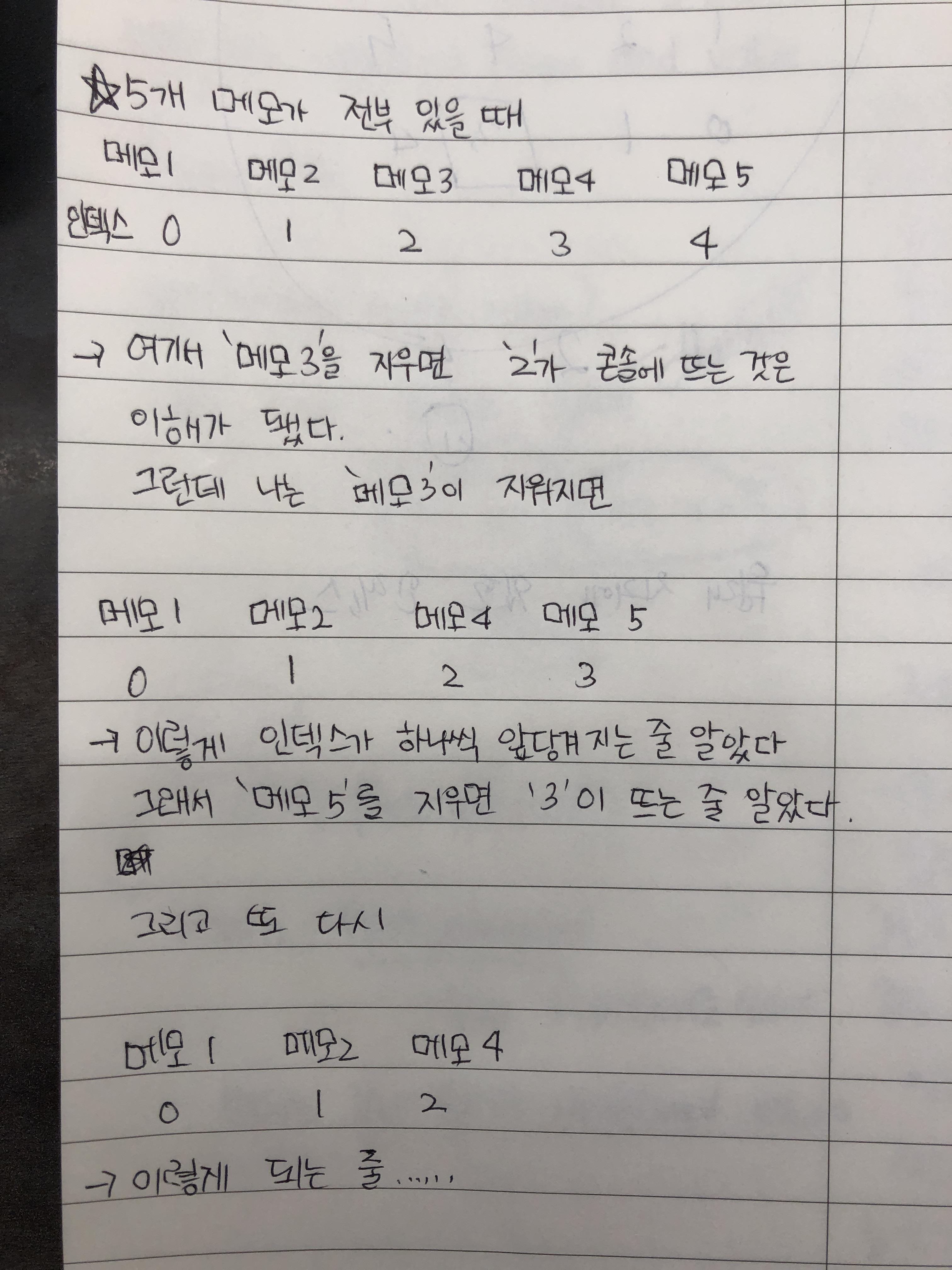 그런데 콘솔창을 다시 들여다보니 어느 순번에 있는 메모가 언제 삭제 되든 처음의 index 를 그대로 기억하고 있기 때문에 콘솔창에 저런 숫자가 뜬다는 것을 이해하게 되었다