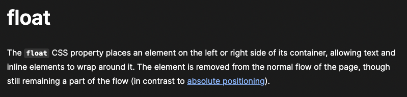 내가 이해한 바로는 float 은 흐름에서부터 떨어져 나와서 왼쪽이나 오른쪽에 배치할 수 있는 속성인 것 같다
